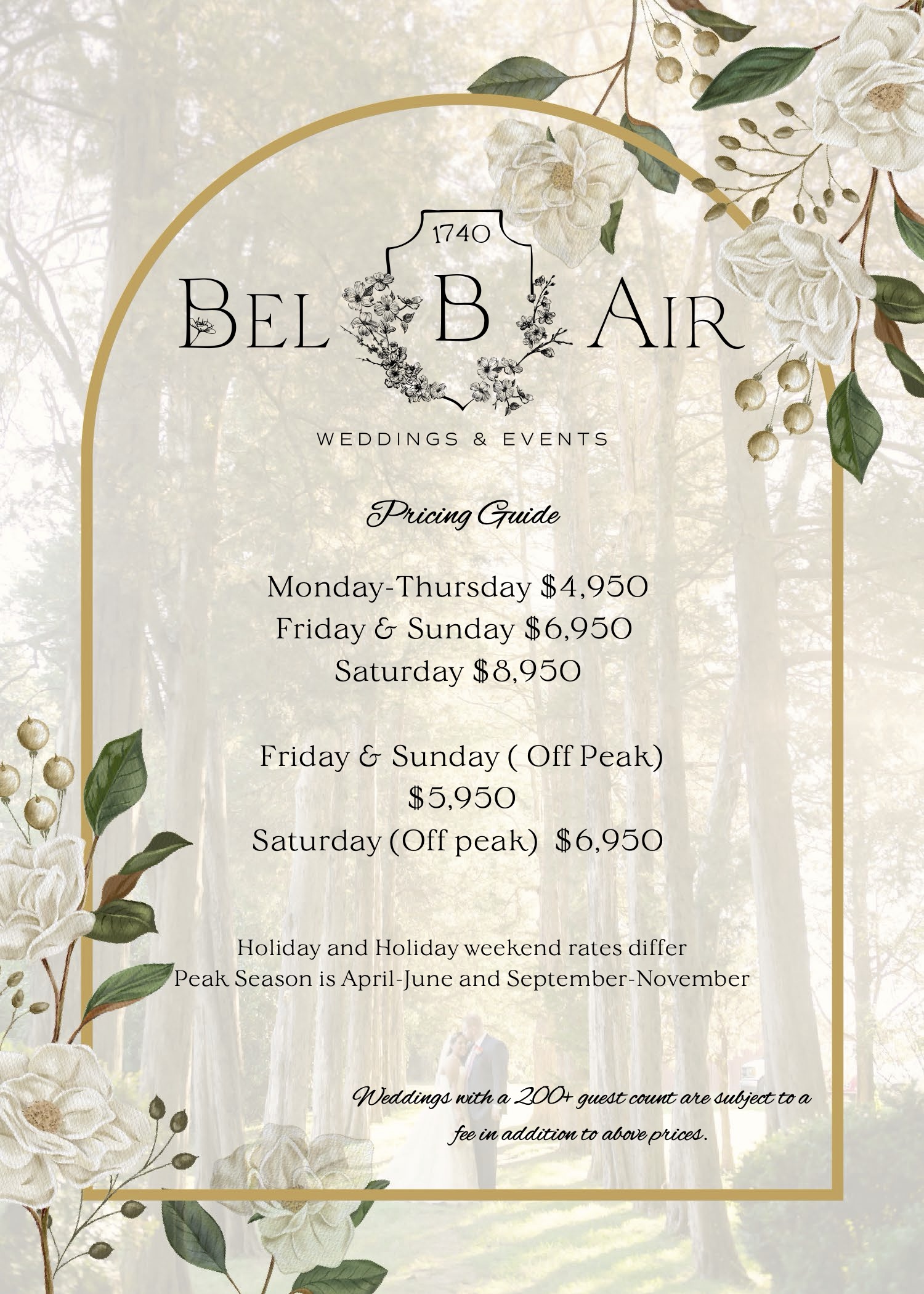 We’re here to help and ensure you have an exceptional experience. To schedule a tour, simply call or email us, and we’ll be happy to assist. The venue is reserved with a signed contract and deposit, which can be completed in person or by mail. Bel Air 1740 offers an Approved Caterers List for your convenience; outside caterers are welcome for an additional fee. Contact us for more details.
